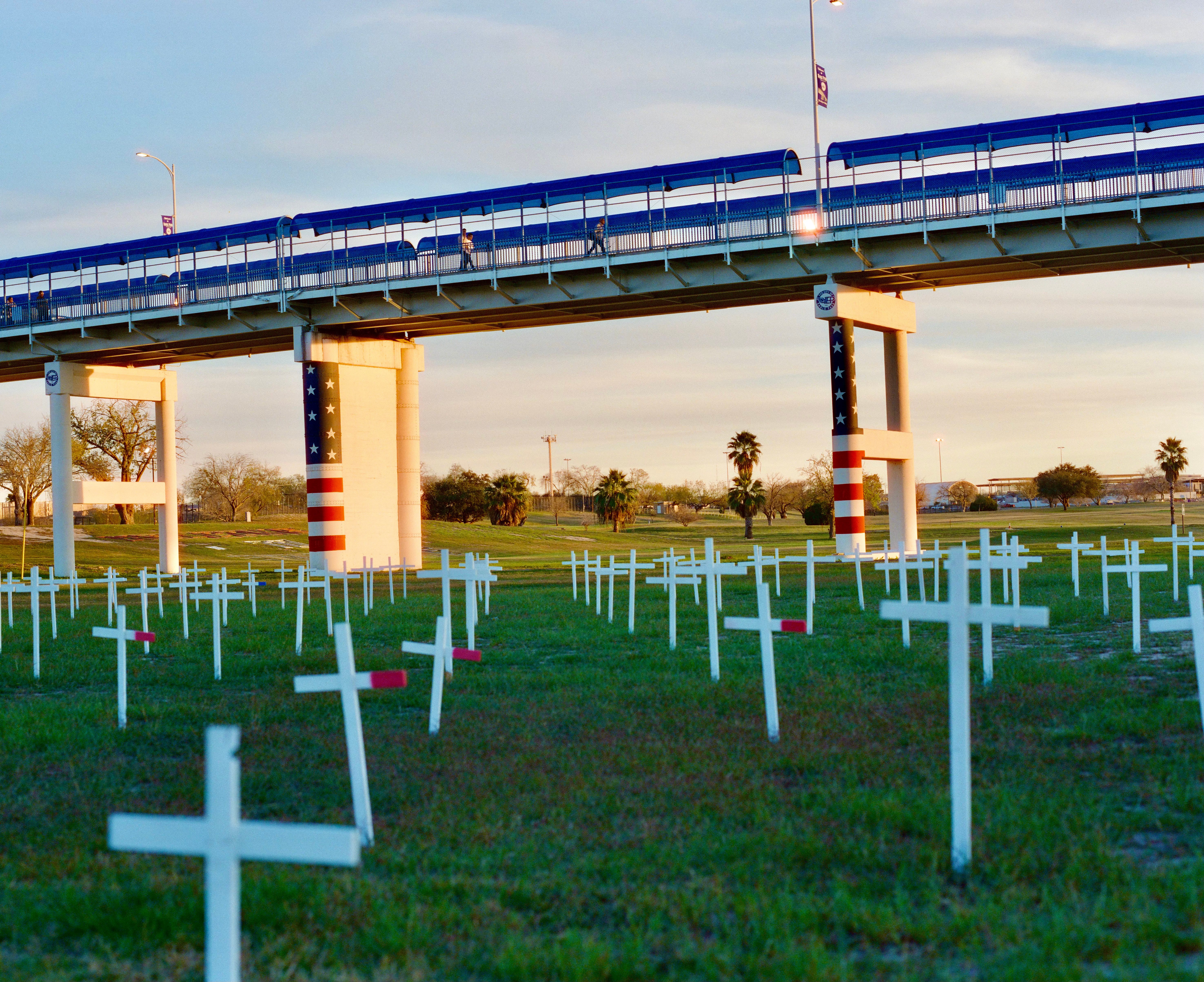 MEYER AND THOMAS: This photograph was taken in Shelby Park, Eagle Pass, which has now been partially closed to function as a 24-hour staging ground for Operation Lone Star personnel and vehicles. Colter took this photograph with his back to that section of the park, looking past a memorial erected by the Eagle Pass Border Coalition to honor migrants who have died along the border, toward a surveillance tower standing on the far side of a public golf course. Overhead is the Eagle Pass International Bridge, connecting the United States and Mexico. Visitors to this location will see a striking spatial representation of the so-called border crisis: not the front line of a war between cartels and brave American troops but parallel routes across the same river, one safe and legal for those lucky enough to have the right paperwork, and another just underneath it, this one potentially deadly and increasingly criminalized.