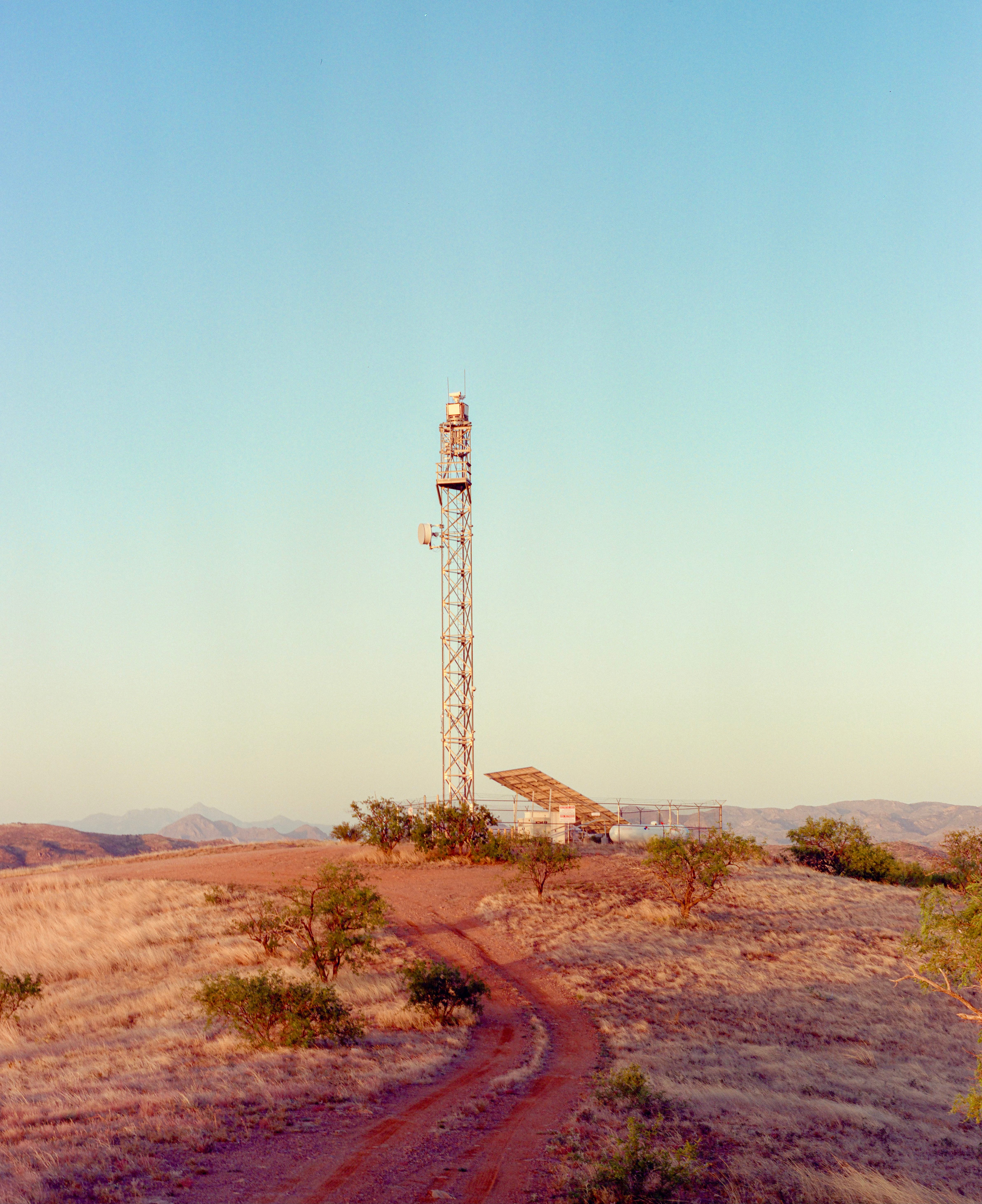 DUGAN MEYER AND COLTER THOMAS: This is the first surveillance tower we visited and photographed for this project, an Integrated Fixed Tower (IFT) manufactured by an American subsidiary of Elbit Systems, the Israeli military technology contractor. It stands southeast of Arivaca in a beautiful region of what is today southern Arizona.