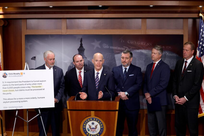 Republican senators gather to express their lack of support for the enforcement heavy bipartisan border bill on February 6. (Photo credit: Anna Moneymaker/Getty Images)