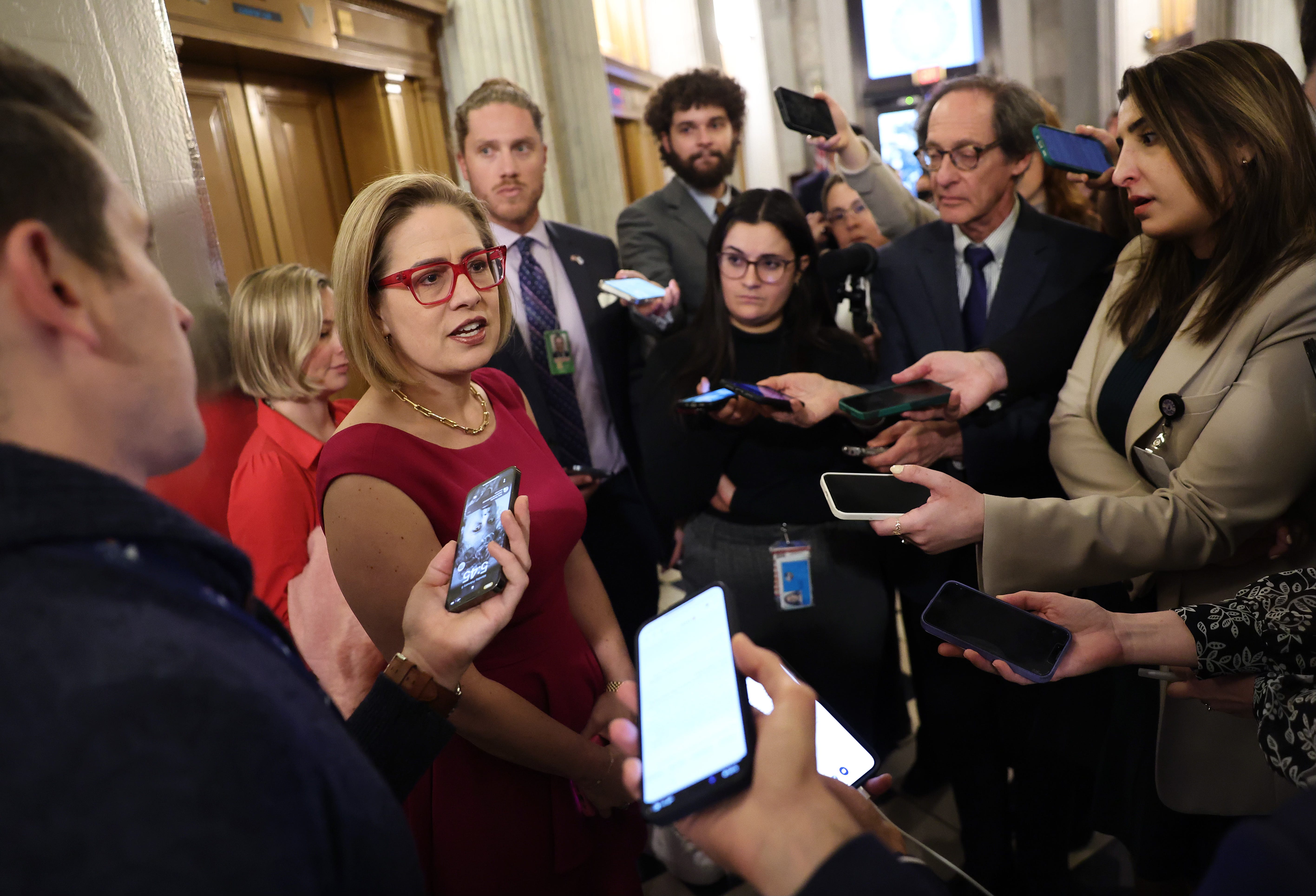 Arizona Senator Kyrsten Sinema argues for the border bill on February 5. (Photo credit: Kevin Dietsch/Getty Images)