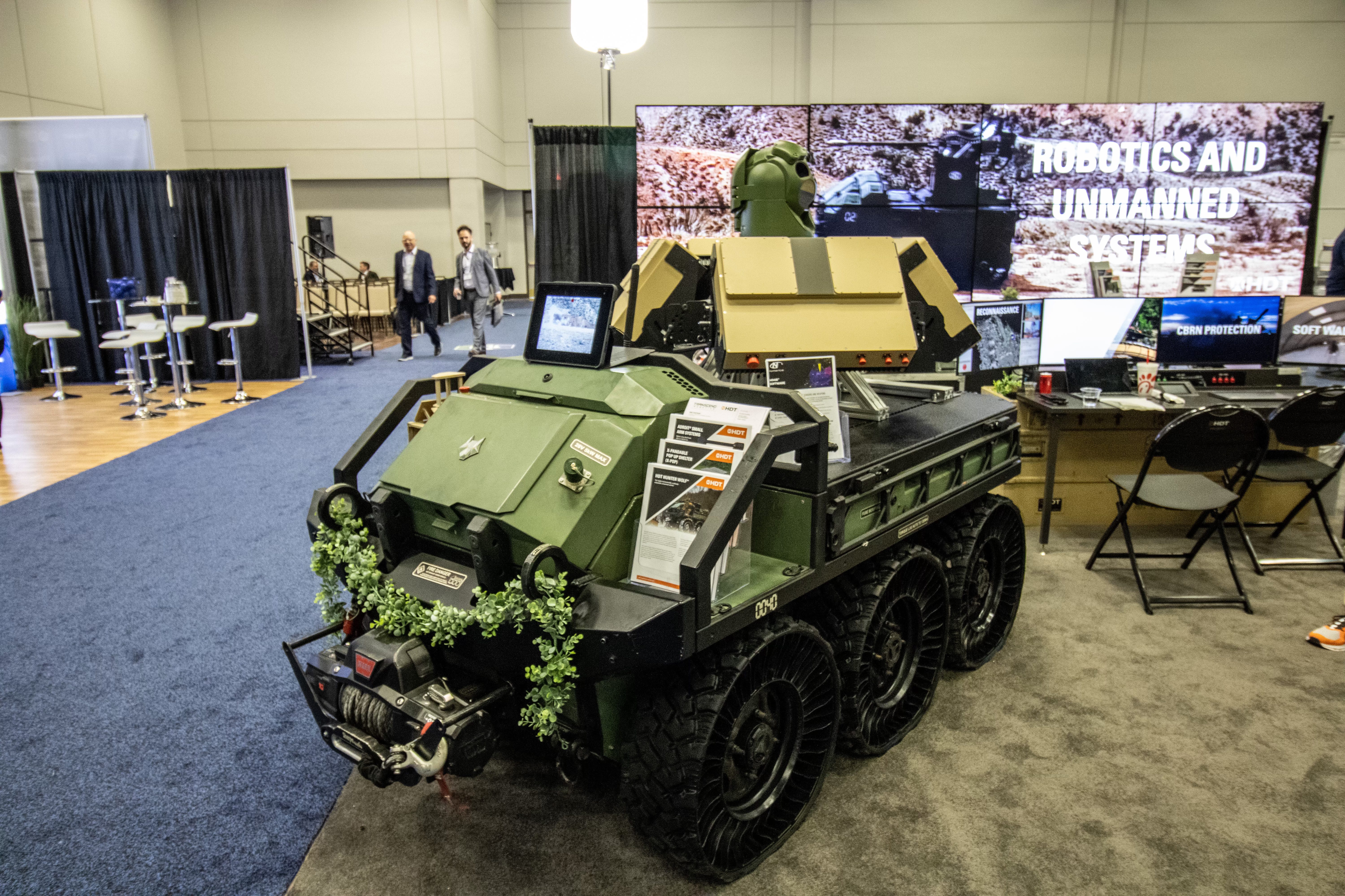 There was facial recognition, biometric systems, cybersecurity, heart beat detectors, command centers, rugged laptops, and kinetic dog food for sale. The dog food advertisement exclaimed, “No corn, soy, or fillers! No BS!” Underneath, a running, growling dog—wearing a tactical vest and backdropped by a helicopter—chased someone, presumably an “adversary.”