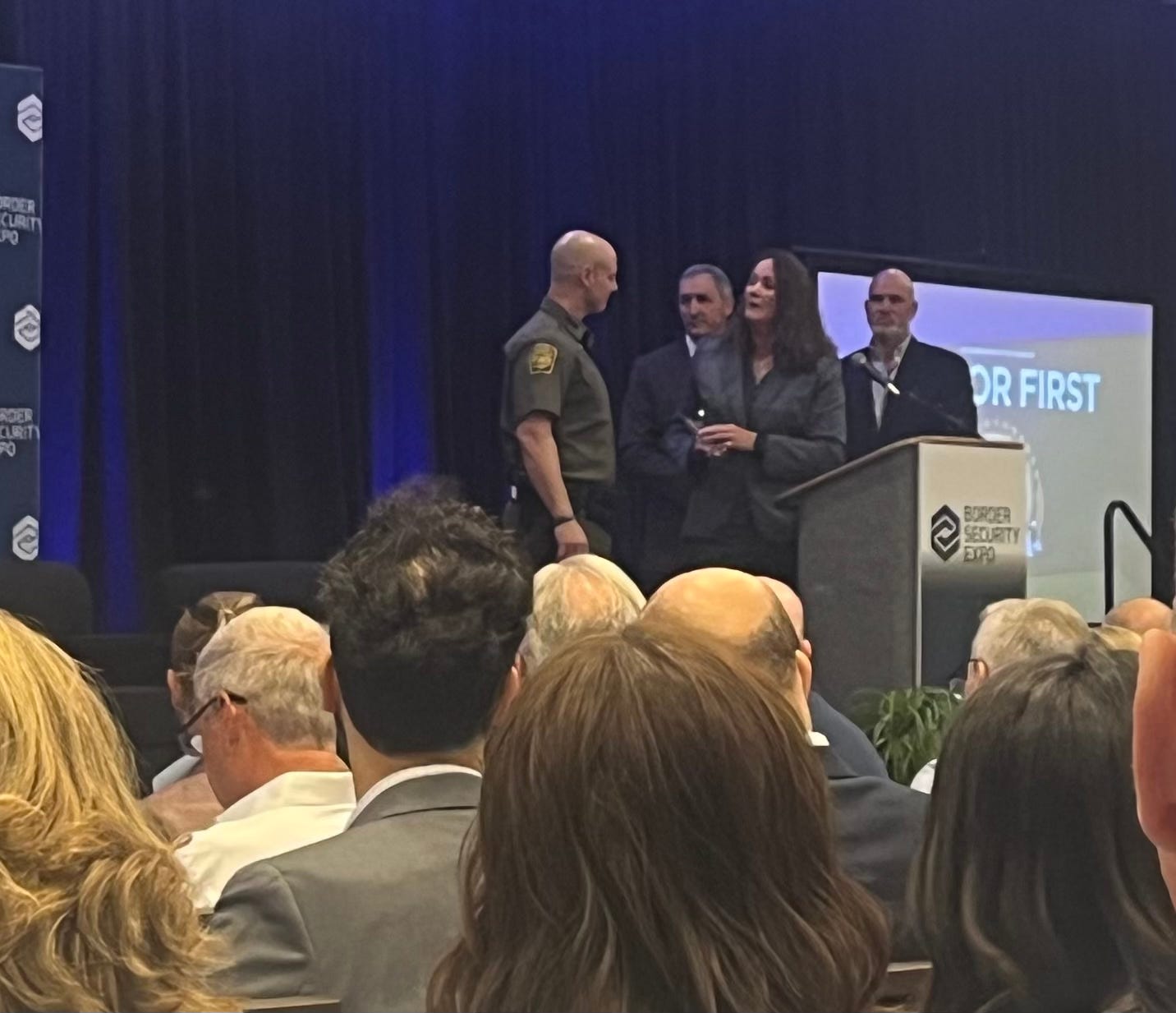 Owens, however, did not seem uncomfortable as he spoke in the crowded conference hall. He looked at the audience of mostly suit-and-tied industry people and addressed them directly. He thanked them for what they did “to bring these new ideas, business, innovation” that “help us get an advantage over a very serious adversary.” That word “adversary”—to describe cross-border threats—would be repeated multiple times by officials during the three-day event. “I know you guys are here on business,” Owens continued. “You’re here to make money.” But it “means the world to us. I want to thank each and everyone of you who contribute to the safety of our green family.” Border Patrol agents, of course, wear forest-green uniforms.
