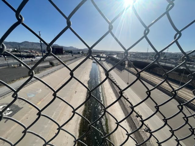 Luckily, the El Paso Convention Center is a mere 10 blocks from the border. Up on top of the Stanton Street bridge, I looked down onto the sickly, trickling, polluted Rio Grande, surrounded by razor wire and walls, stared at by cameras and agents and police. This was how all that stuff in the exhibition halls looks on the actual border. In the past couple of years, I’ve seen huge groups of people wade through the contaminated water to get to the large wall on the U.S. side. I thought about the 149 people who died crossing the border in the El Paso sector in 2023. Perhaps the tequila incident was a big deal, but the real scandal wouldn’t be reported at all.