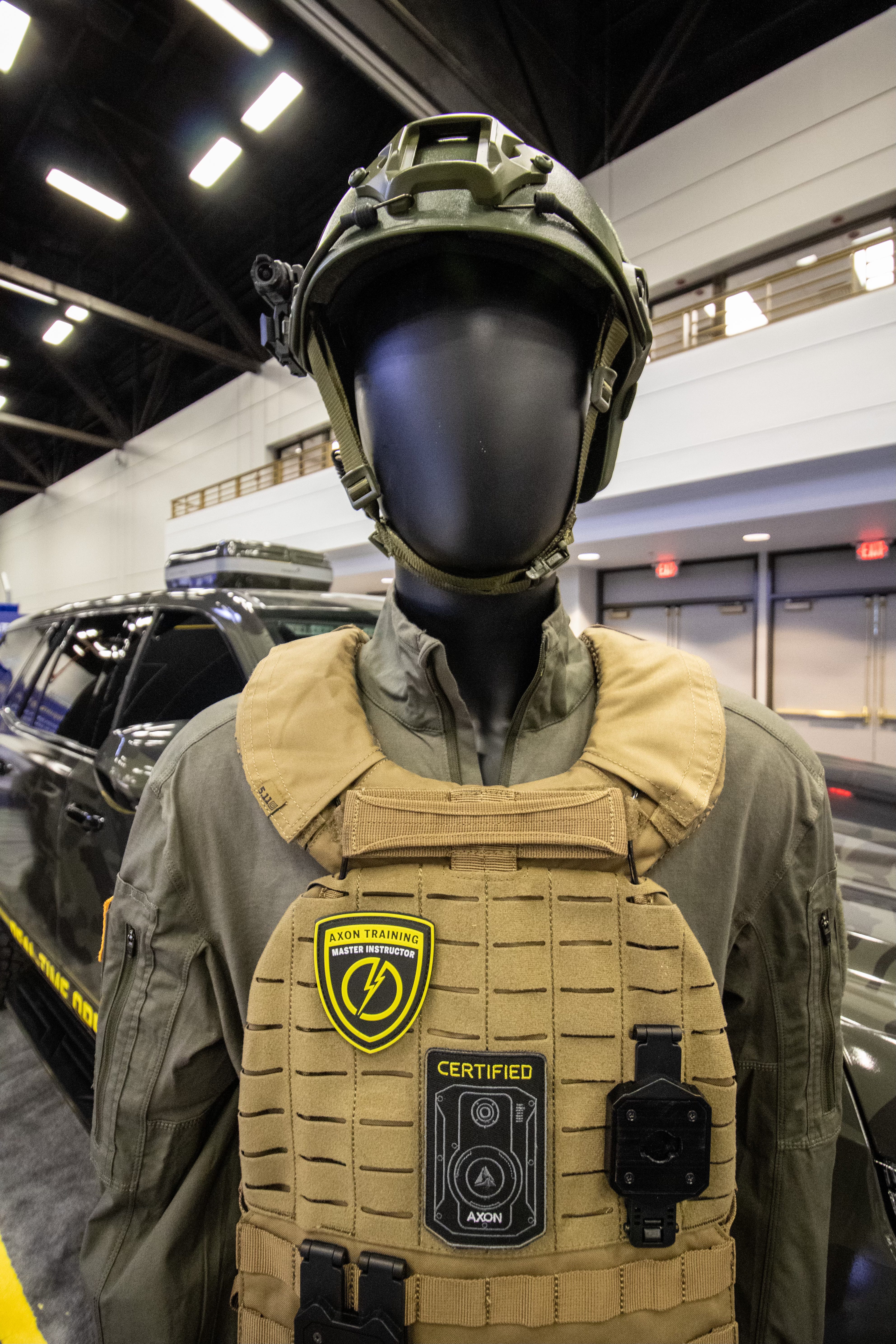 Some of the “solutions” were on display in the exhibition hall, where nearly 200 vendors—large and small—displayed their wares. It was a thicket of surveillance technology where robotic dogs courtesy of Verizon and AT&T trotted on gray carpets, large monitors showed off AI-fueled camera systems, and armored all-terrain vehicles were backed by a large video screen that depicted them rumbling through war zones. There were mannequins with helmets and headsets and bulletproof vests looking like they could take over El Paso on command, fake border walls armed with “smart” technologies, BuckEye camouflaged cameras.