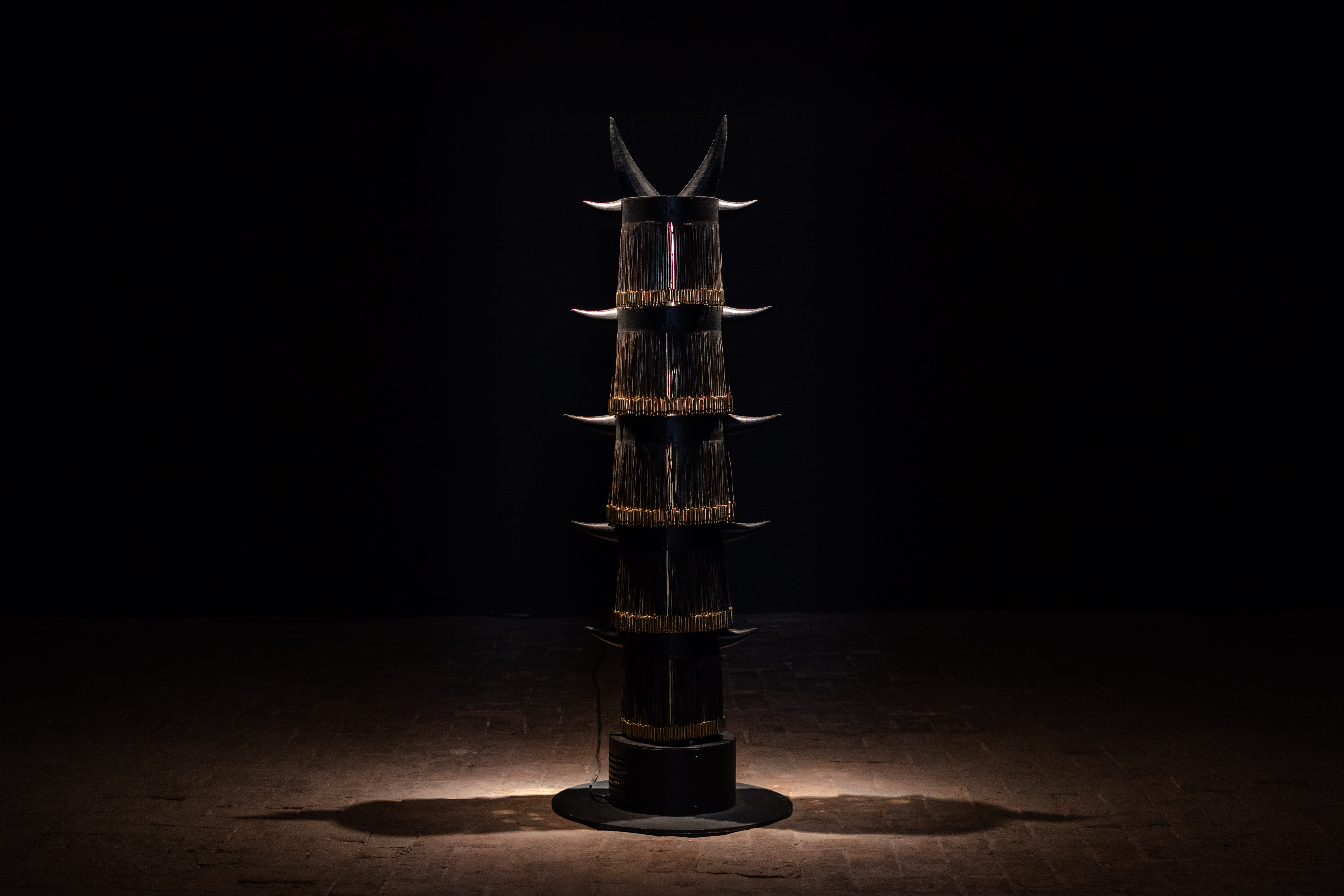 The procession of ironwood figures leads to a doorway beyond which is undoubtedly the most powerful piece of Legado de fieras: Detonaciones (Detonations). This piece is set apart from the rest in its own room. The walls are pitch black; the only lights are those that shine down from the ceiling on the piece, a cylindrical body about six feet tall. With black horns jutting out from its sides and its head, it is divided into five segments, each of which is hung with leather strings that have bullet casings at their ends.