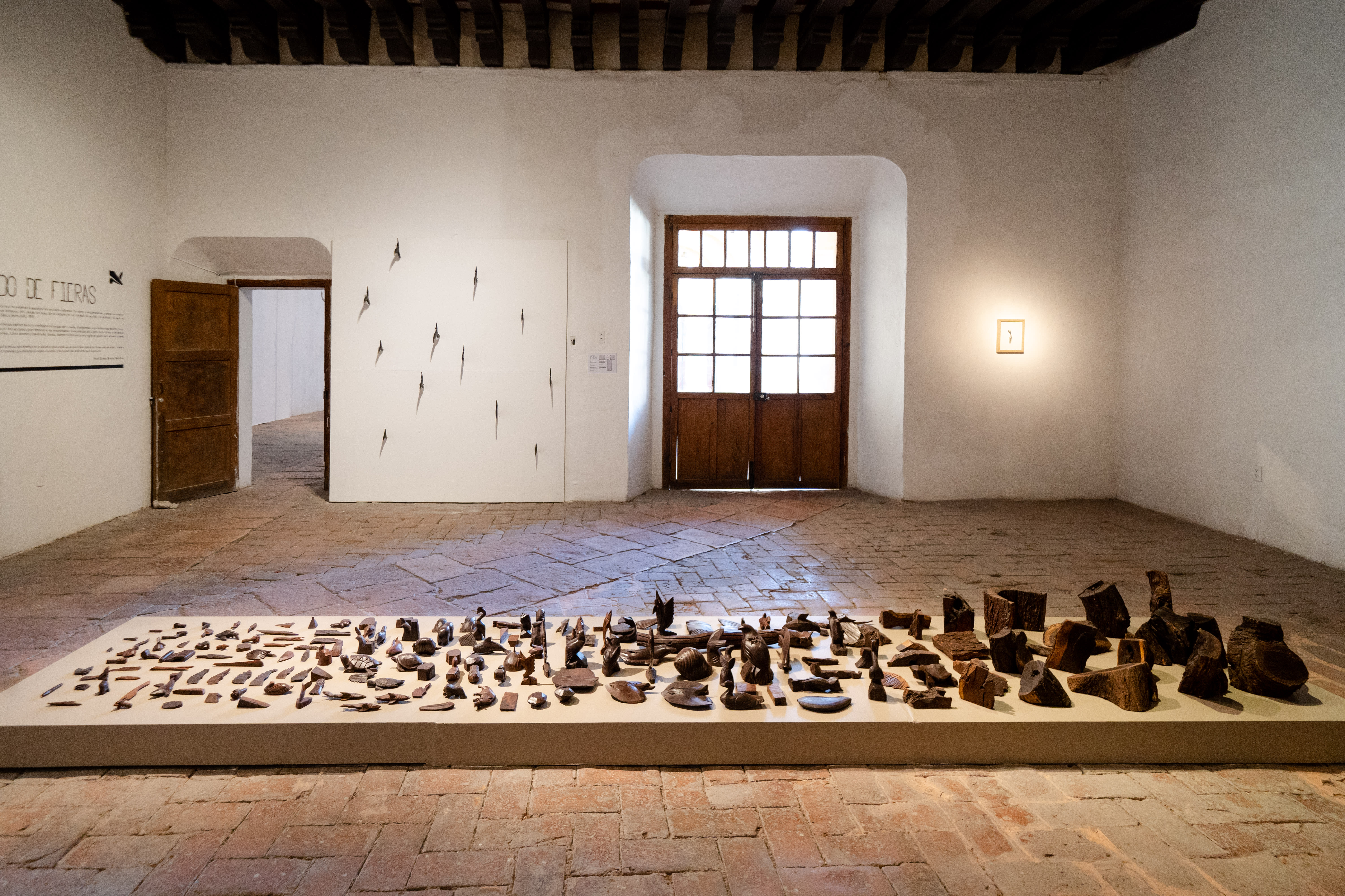 Salado’s installation arranges the ironwood objects from large intact chunks to medium-sized skinned but uncarved pieces, to, finally, smaller carved figures of birds, fish, tools, and wings that were left unsold due to defects. It evokes the same powerful sense of absence and time passing as the hoof casts. Yet it also adds a layer of elegy for change: on the facing wall is Detritos (Detritus), a group of burned, blackened ironwood figures that sit amid charcoal in a ruined jumble. It evokes the increasing number of wildfires that have afflicted the Sonoran Desert in recent years.