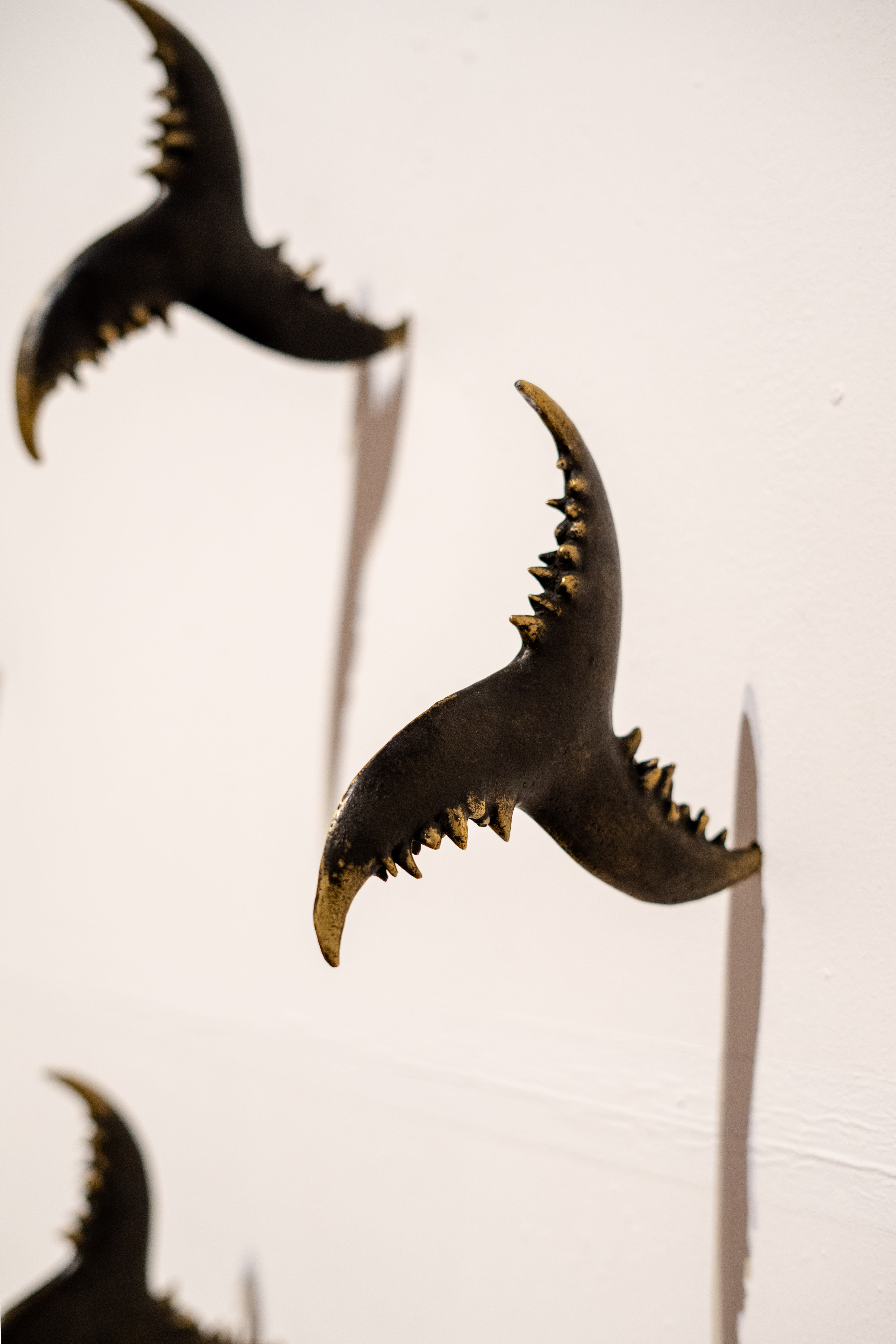 Salado’s speculative botanies then become three dimensional. The piece Sin título, part of the series Mutaciones bestiales (Bestial mutations), takes the form of 12 objects cast in bronze that resemble ninja stars formed out of three melded animal jawbones. They protrude from the wall as though having been flung against it: a representation of human violence that draws from and merges with the visual language of a harsh natural world.