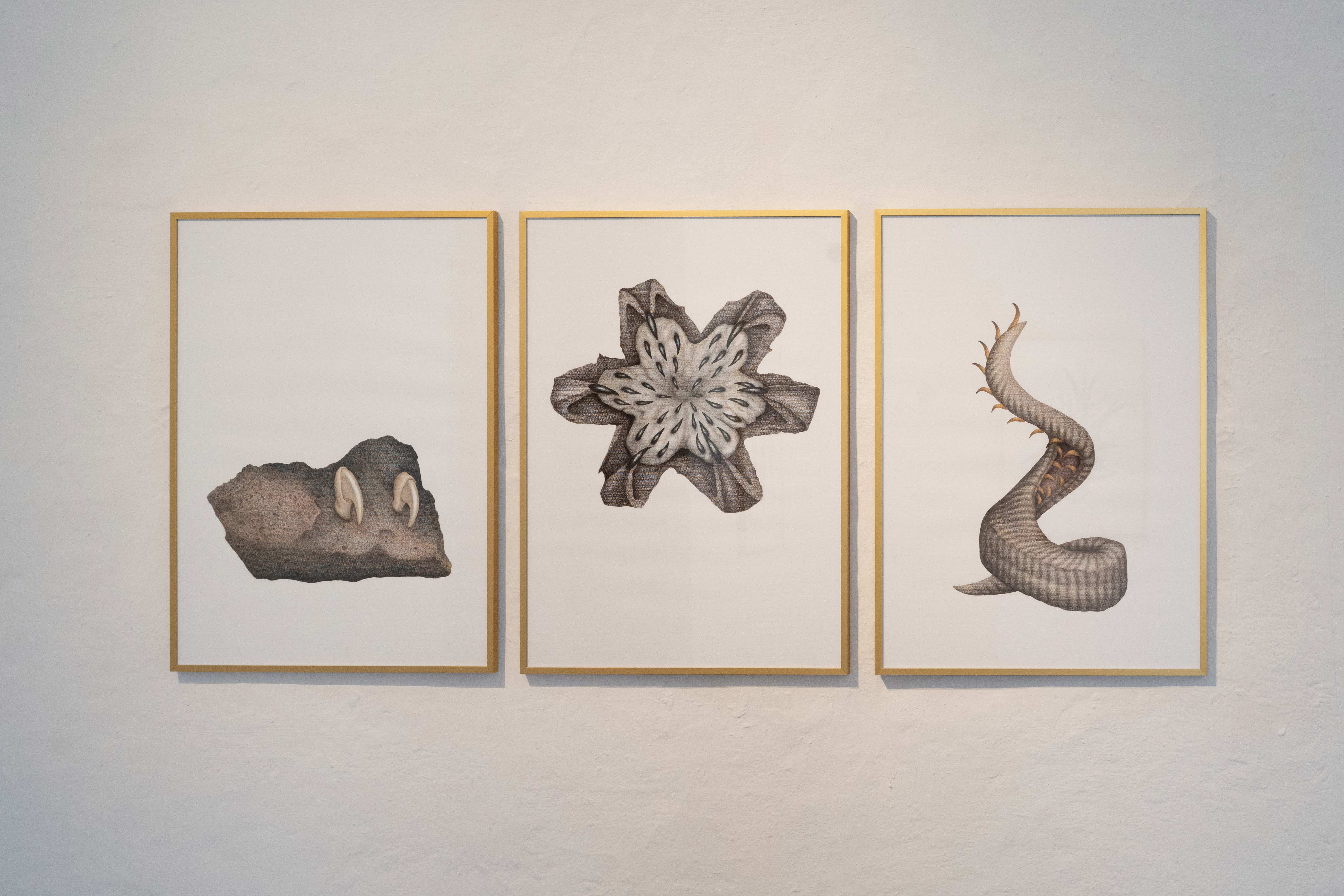 On the walls surrounding the plaster casts of Marcha are a series of large-format colored-pencil drawings. At first glance, they resemble scientific illustrations. On closer inspection, however, they mix and extend familiar desert life-forms into something that appears more supernatural. In one set of three images, drawn in grayscale with accents of yellow-orange, a volcanic rock grows talons, the seeds of a barrel cactus fruit become claws, and a ram’s horn twists into a serpent and sprouts curved spines. They resemble Georgia O’Keeffe’s illustrations of cow skulls but with an ambience that verges on menacing.