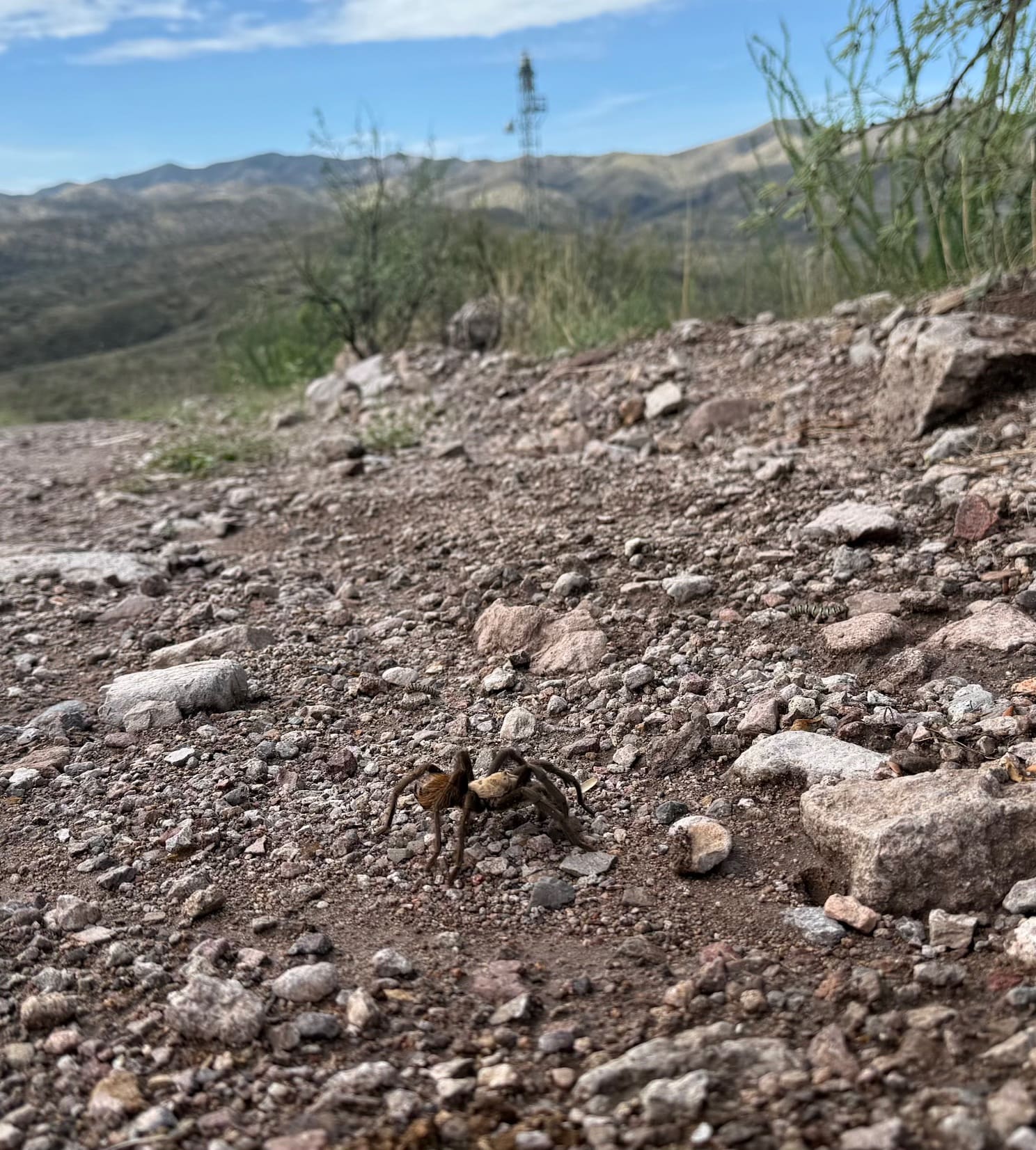 I lie flat on my stomach to snap a photo of the tarantula with the tower in the background. The contrast seems important, even insightful. The tarantula has been around since at least the Cretaceous period, 120 million years ago, while the tower has stood since 2015. This day presents a paradox: what seems strong is, in the grander scheme, fragile.