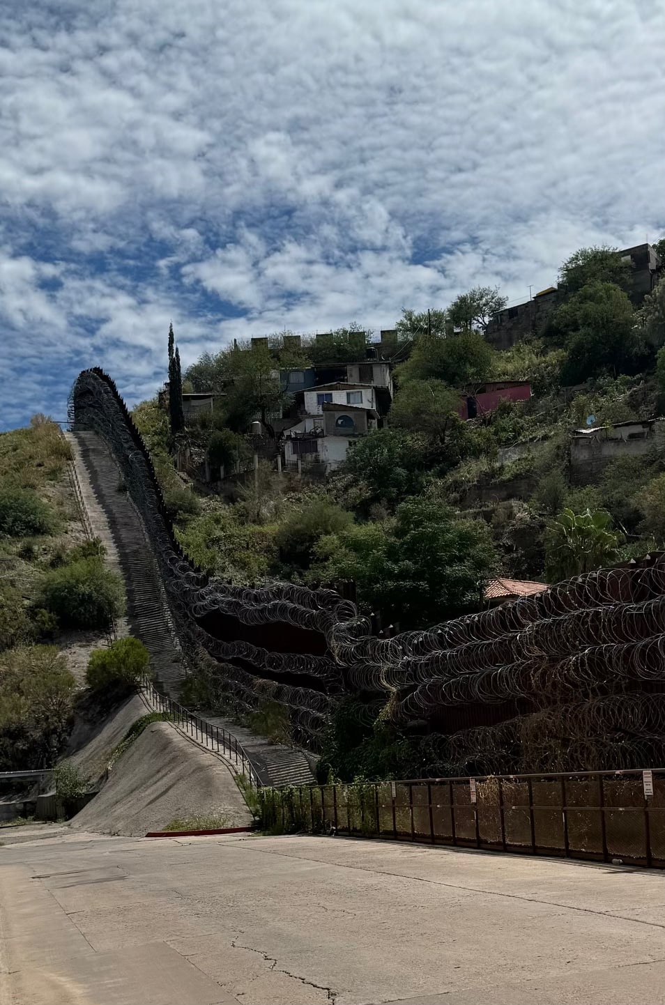 After the tower, the next stop with the student group was La Linea Art Studio in downtown Nogales on Morley Avenue, half a block from the border wall, which featured intense coiling razor wire. There were six rows of wire covering the 20-foot bollard wall completely, leading up a hill behind which were the colorful houses of Nogales, Sonora’s Embarcadero neighborhood. This was the very concertina wire that prompted La Linea to open its doors in 2019. Its director, Aissa Huerta, said in a video interview that the arrival of the wire “was like waking up one day and being in a war zone. It was like a punishment. It made downtown look like a prison. It made Nogales look like a police state.”