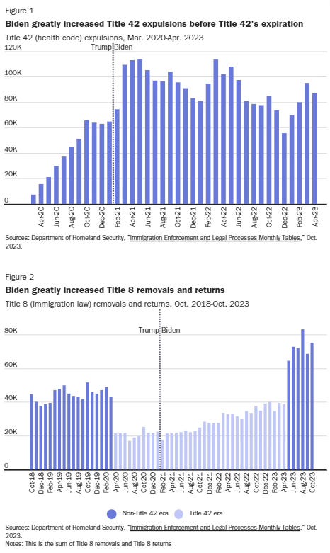 But post hoc ergo propter hoc is a common fallacy for a reason. Migration did increase after Biden’s inauguration, so it’s easy to say, “After this, therefore because of this.” Biden did change some policies, but those changes mostly increased the efficiency of removals. You can’t efficiently target everyone, so he’s prioritized border enforcement. As a result, you can’t find a major enforcement measure that Biden has cut: arrests, detentions, or removals. Biden has increased` removals to levels not seen at any point during the Trump years (even though Trump released about 1 million crossers). All this enforcement obviously hasn’t stopped migration from overwhelming the Border Patrol’s ability to deport everyone who arrives. But this doesn’t show that Biden opened the border. It shows why we need a different approach.
