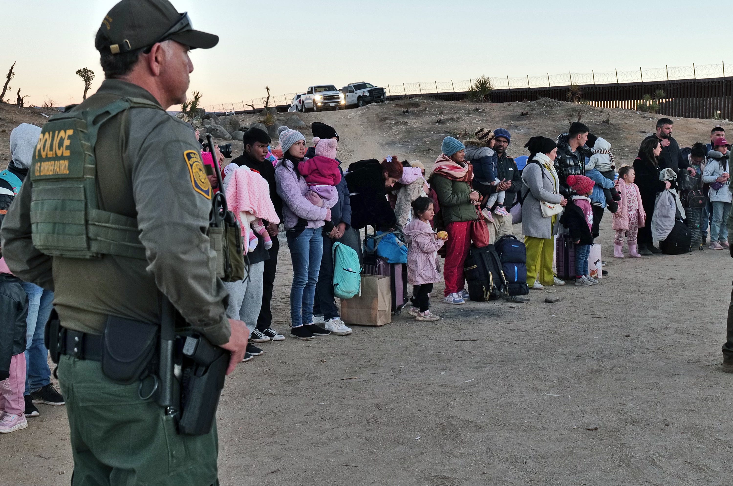 People detained by U.S. Customs and Border Protection in Jacumba Hot Springs, California near the U.S.-Mexico border in December 2023. (Photo credit: Nick Ut/Getty Images)