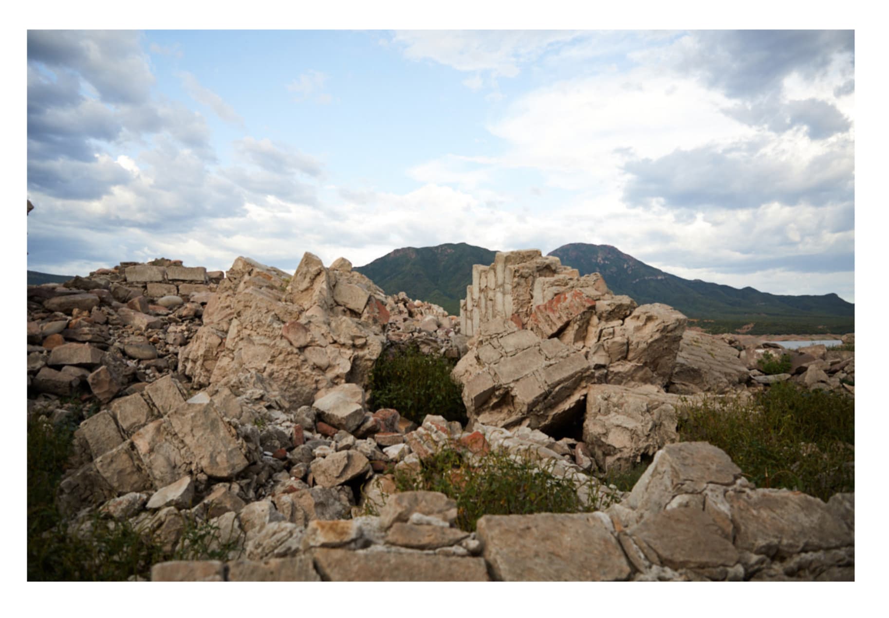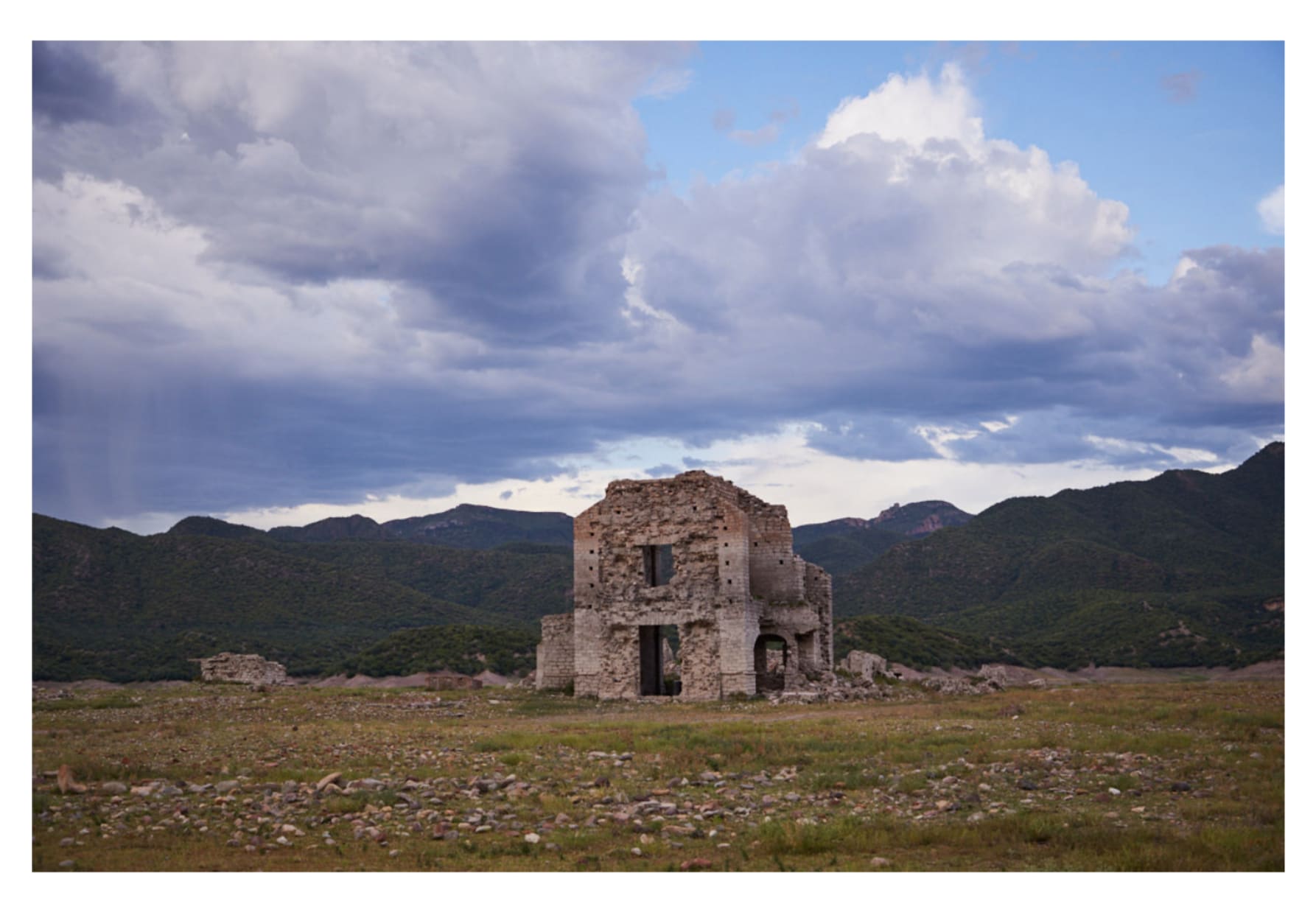 One of the photographs shows what appears to be a former church, a structure falling apart brick by brick, but whose arches and buttresses are still visible. It stands in a field of green grass in the foreground of a mountain range, as though it were a natural part of the ridgeline. Both the structure and the former lakebed have become visible as drought, climate change, and overuse have caused the reservoir’s waters to recede.